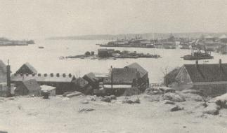 ![]() From the Parker Street hill above the Head of the Harbor and Smoky Point. In this 1920s view, Five Pound Island, Duncan's Point beyond it, and Rocky Neck at left evoke Fitz Hugh Lane's perspective of seventy years earlier. The Fish Pier By walking clear to the end of the Fish Pier we reach the last dirt of Five Pound Island, where farther back than most of us can remember there were some fishing shacks and a wharf or two, and far previous to that probably five sheep pounds to half-match the ten on Ten Pound Island.Out there between the spindle and the freezer piers to out right, long before the channel was dredged and when there wasn't water to float a deep-draft vessel at low tide, Captain Lindsay and the British Falcon on August 8, 1775 chased a Salem-bound West Indian schooner hard aground on the flats. The First Parish Church bell changed forth the alarm. The patriots dropped everything and mustered around the shore. Lindsay sent thirty-seven men in boats to seize the prize. A smart skirmish followed, during which three Redcoats were killed. The infuriated captain of the Falcon shelled the town and dispatched a boat around to the Fort beach to set the fish flakes afire and burn this hotbed of rebels to the ground, but our people rushed to the spot and captured them all. In the meantime, out here before us, the Gloucestermen kept up their fire, and then they waded out, rescued the schooner, and took cutter, barges, and invaders. We lost two of our own, Peter Lurvey and Benjamin Rowe. Captain Lindsay sailed out the beautiful harbor which spread forth yonder and was never seen in these waters again.